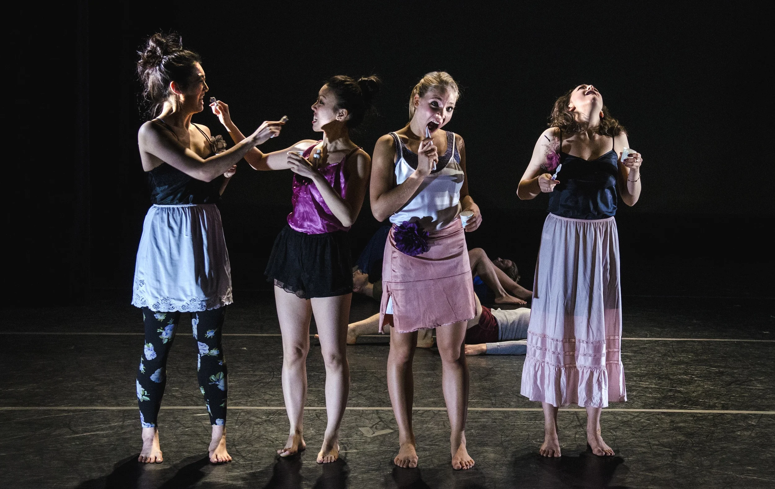 A dark comedy with squirrelly, grotesque characters. Set to music by Tom Waits. The quartet of women move with smeared makeup and exaggerated expressions while the trio prances around screaming and clapping. The dancers’ actions and reactions paired with the grotesque sounds of Tom Waits paints an absurd, yet comical scene.